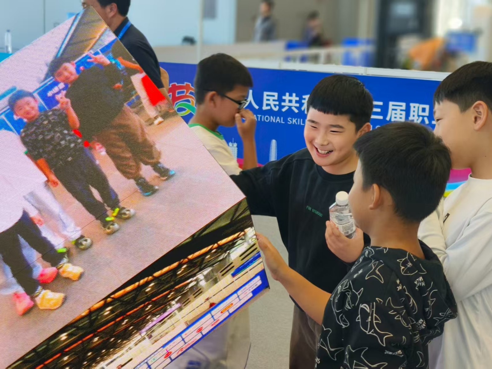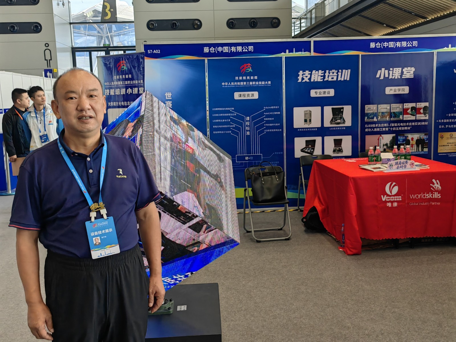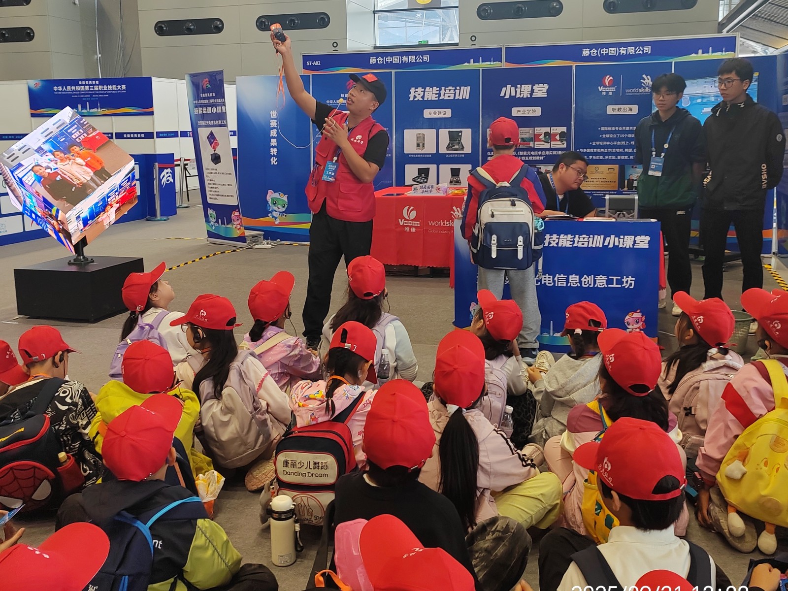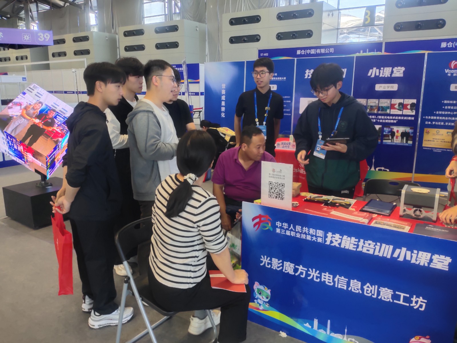 在S7-A01展位,唯康教育特別打造“光電信息技術技能培訓小課堂”。展區融合世界技能大賽標準,帶來沉浸式互動體驗:會旋轉的六面魔方屏突破平面屏限制,觀眾可通過手機App實時投送圖片與視頻,實現人與設備的光影互動;激光雕刻模組則讓木板瞬間變為創意畫布,輕松定制專屬LOGO與藝術紋樣。趣味與專業并重,展示了技能的創新之美。