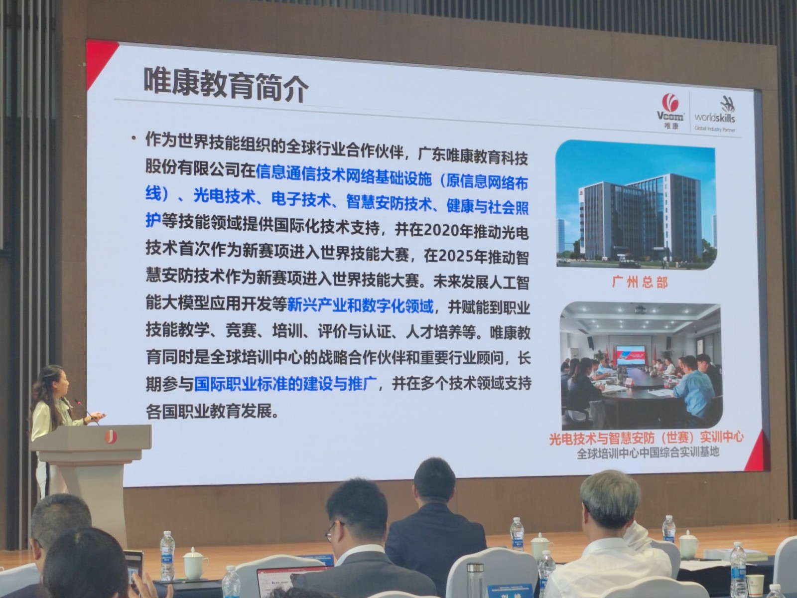 唯康教育總經理王艷鳳出席活動并發表主旨報告《世賽新項目開發與實踐》。報告中,王總圍繞世界技能大賽新項目開發的核心邏輯、實踐路徑,以及技能競賽成果轉化的關鍵方向展開深入分享,介紹了唯康教育依托全球培訓中心,從課程資源開發、新職業標準制定、職業技能等級認證、技術標準輸出、企業出海人才本地化培養、院校專業建設等多個維度,全方位推進競賽成果向教學資源、產業應用轉化的具體實踐,為現場嘉賓提供了極具參考價值的經驗借鑒。